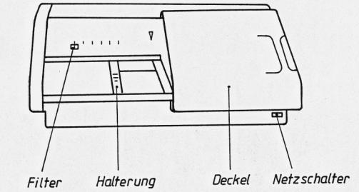 Das Densitometer enthält nur wenige Bedienungselemente: den Netzschalter, den Deckel, die Objektbefestigung und den Filterschieber.