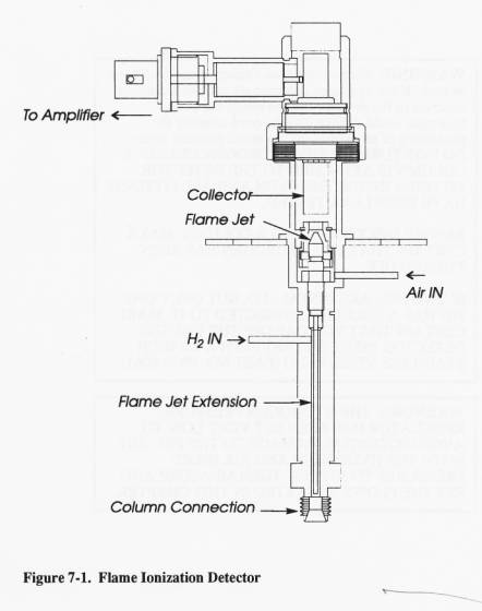 On entering the detector, the Sample is mixed with hydrogen and then burned in air, generating ions. These are collected and measured by the detector, the concentration being proportional to the amount of compound present.