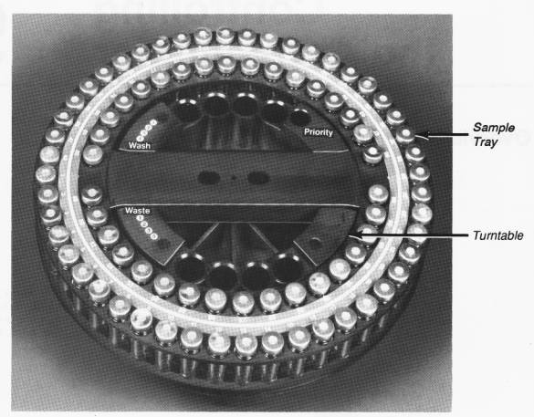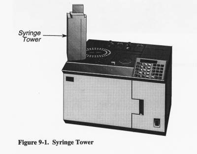 The autosampler contains three basic parts: a syringe tower, a turntable, and a sample tray (see Figures 9-1 and 9-2). The syringe tower can contain either a 0.5-µL, 5.0-µL, or 50.0-µL syringe. The sample tray contains positions for eighty-two 2-mL sample vials. The turntable contains one priority sample vial, four 4-mL waste vials, and four 4-mL wash vials.