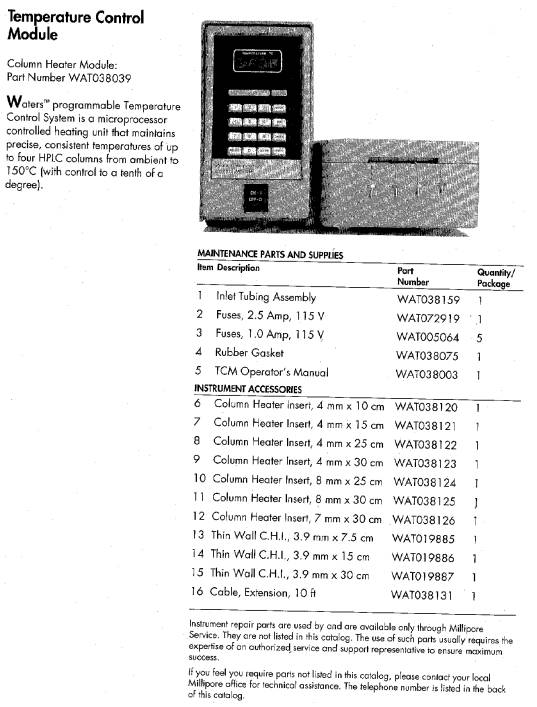 The WatersTM Temperature Control System (Figure 1-1) consists of the Temperature Control Module (TCM) and one or more column heaters. The System provides stable operating temperatures for columns and insulates them from changes in ambient temperature.