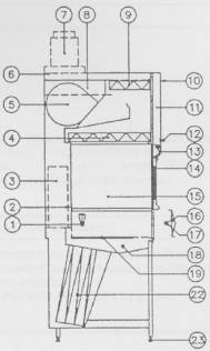 Die Abluft wird ebenfalls durch Hochleistungs-Schwebstoff-Filter geleitet. Die Frontseite der Werkbank ist im Betrieb teilweise etwas geöffnet. Der obere Teil besteht aus einer zu öffnenden Sichtscheibe. Unterhalb der Sichtscheibe befindet sich die Arbeitsöffnung.
