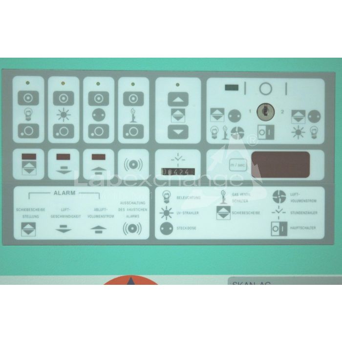 Löst akustische und optische Warnung aus; bei unkorrekter Abluft, unkorrekter Laminarströmung und falscher Position der elektrischen Schiebescheibe.