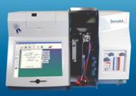 Single beam (SensAA) or double beam (SensAA Dual) with background correction and flame emission capability. The SensAA Dual has asymmetric modulation with 2:1 sample-to-reference ratio for noise reduction. All-reflective system with quartz overcoating on mirrors. Dust cover over optical system.