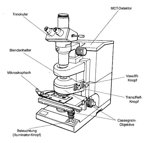 · Perkin-Elmer Hochleistungs-Cassegrain-Sammeloptik für die IR-Mikrospektroskopie. Das im Mikroskop verwendete Cassegrain-Spiegelsystem hat eine hohe numerische Apertur für eine leistungsfähige Bündelung der Strahlung.