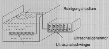Eine Ultraschallanlage zur Reinigung besteht grundsätzlich aus drei Komponenten.