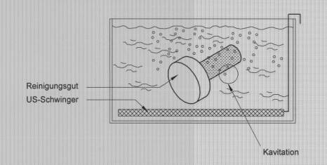 Kavitationsblasen entstehen vorwiegend an den Grenzflächen zwischen Flüssigkeit und Reinigungsgut. Also genau dort, wo sie erwünscht sind.