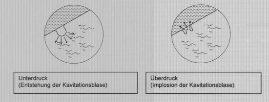 Während der Phase des Zusammenziehens, die gleichbedeutend mit der Unterdruckphase ist, entstehen in der Flüssigkeit infolge ihrer begrenzten Zugfähigkeit unzählige, kleine Hohlräume.