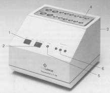 Der Thermostat LTG 037 gestattet das Erhitzen von Lösungen in Rundküvetten verschiedener Größe auf 100 bzw. 148 °C. Zur Aufnahme der Küvetten verfügt der Küvettenblock über 16 Öffnungen, von denen 12 für normale CSB-Küvettenteströhrchen und vier für größere Reaktionsgefäße vorgesehen sind, wie sie beim CrackSet und beim Chromküvettentest verwendet werden. Die gewünschte Temperatur und Heizdauer können über die Schalter 1 und 2 am Gerät eingeschaltet werden. Der LTG 037 ist mit einem Temperaturanzeigesystem ausgestattet. Bei Erreichen der Solltemperatur leuchtet die Sollanzeige (SOLL) auf. Abweichungen von dieser Temperatur zeigen die Leuchtanzeigen (+) oder (-) an, was eine Über- bzw Unterschreitung des Solls bedeutet.