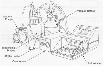 The fluid delivery system includes a compressor that forces fluid from dispensing bottles into the Autowasher, and a vacuum pump that pulls fluid from the system into waste bottles .