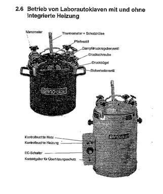 Nachwärmen : Nach Beendigung der Sterilisation mit ein geschaltetem Medienfühler kühlt das Gerät auf 60°C ab, Diese Temperatur wird bis zum Abschalten gehalten um eine Weiterverarbeitung von Nährmedien zu ermöglichen.