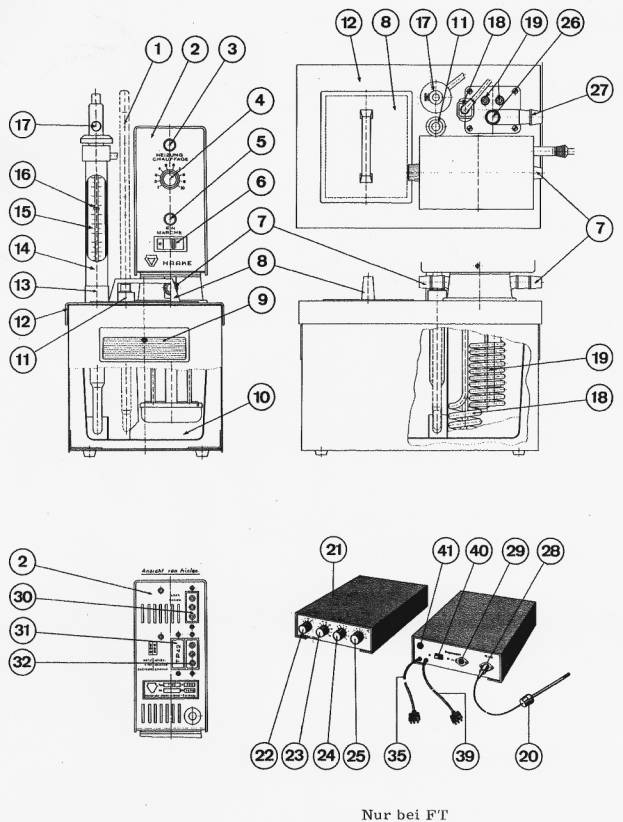 An der Rückseite des Thermostat-Grundgerätes befinden sich der Ein - Aus - Schalter für die Kältemaschine und eine Schukosteckdose, Bei Arbeitstempera­turen über 50°C sollte, über 100°C muß das Kälteaggregat ausgeschaltet werden. Wenn der FK bei Temperaturen über 50°C betrieben wird, darf man die Kältemaschine ausschalten, sollte sie aber nicht sofort wieder einschalten.