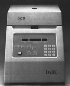 The Dade® Automatic Centrifuge II is a laboratory bench-top, multi-purpose, electromechanical instrument designed to perform cell washing and immunohematology procedures including cell resuspension. lt provides the laboratory with a fast wash cycle capability, thereby lowering laboratory time costs. lt can be easily programmed to automatically perform one, two, three, four or five wash cycles per test sequence. Each cycle consists of programmed saline introduction and subsequent decanting during centrifugal rotation. The System provides a saline monitoring feature to warn the Operator when saline is not being delivered. The centrifuge incorporates variable spin times for several different types of centrifuge operation. Decant RPM is Operator adjustable to give more than 0.1 mL residuals if desired.