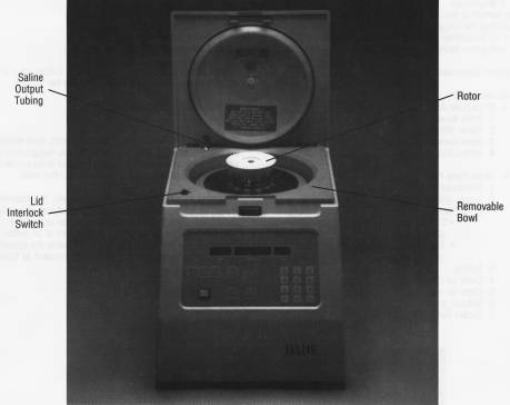 A. Centrifuge inner bowl - The centrifuge inner bowl houses the centrifuge rotor with 12-tube carrier. Access to these components is gained by opening the centrifuge top cover. The inner bowl is easily removed for cleaning. Warning: After replacing the removable bowl, and before installing the rotor, rotate the rotor drive by hand until it turns freely. The saline dispensing adapter, located on the top and inside of the centrifuge cover, is connected to the saline pump by the saline output tubing (see Figure 1-3). The saline drain outlet is located at the rear of the centrifuge bowl and extends out of the rear of the instrument. An overflow drain is located just above the normal drain fitting.