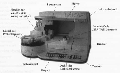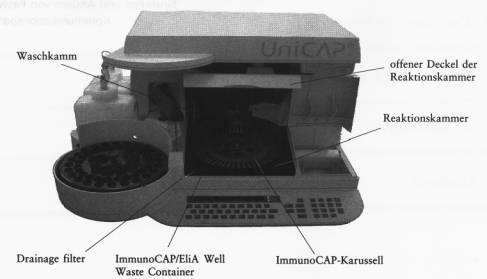 UniCAP 100 ist ein vollautomatisches Gerät, das die Software für immunodiagnostische Labortests enthält. Das Gerät ist dafür vorgesehen, Proben, ImmunoCAP/EliA Wells und Reagenzien zu verteilen. Es bearbeitet alle Schritte von Inkubation, Waschen, Messen bis zum Berechnen und Ausdrucken der Ergebnisse. Es basiert auf einer einzigartigen ImmunoCAP und EliA-Technologie von Pharmacia Diagnostics AB. Diese Technologien sind eine Weiterentwicklung des Pharmacia CAP Systems sowie von den ebenfalls von Pharmacia Diagnostics AB entworfenen Phadebas/Phadezym/ RAST.