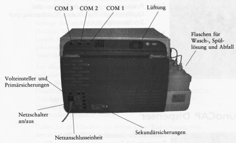Die Wasch-, Spül- und Abfallflaschen befinden sich auf der linken Seite des Gerätes, hinter dem Probenkarussell. Wenn Sie diese Flaschen am Gerät
