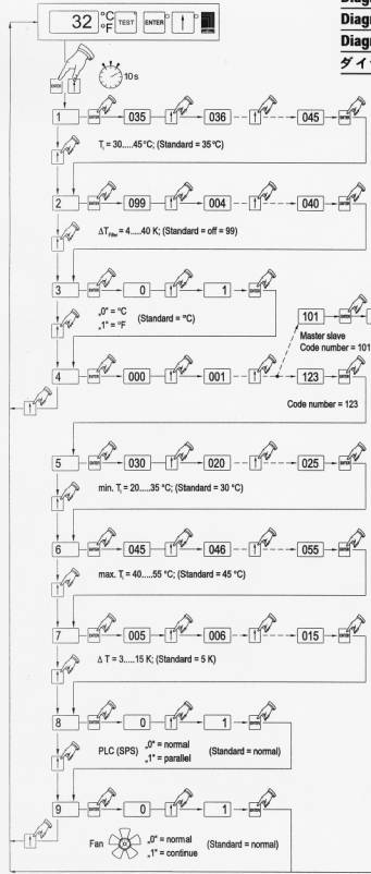 Factory setting is the shut off valvue (99). To activate: 1. Install clean filter mat and let air conditioner cool for a few minutes. 2. Select programm level 2. 3. Push test button 10 seconds. Temperature difference is diplayed. 4. Using the ↑ button adjust the temperature 2-3 K above the displayed value. |
