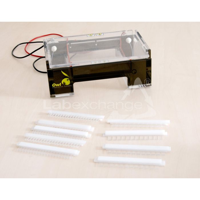 Owl B2 EasyCast Mini Gel System provides the most flexibility in a very small footprint. The longer gel length and the two comb slots give you the flexibility of running 8 to 48 samples on one gel. The optional multi load tray can increase the maximum number of samples to 108 in a multichannel pipette format. The simple to use casting method, and multiple comb and tray options, makes this Owls most popular system.