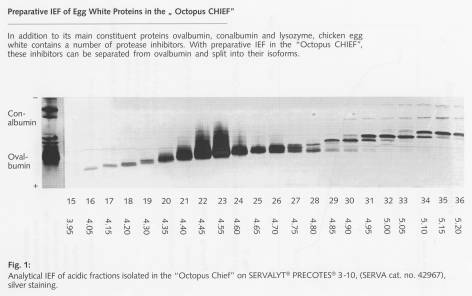 - Die mit dem Gerät OCTOPUS erzielbare Trennleistung ist im Hinblick auf die Auflösung vergleichbar mit analogen analytischen Elektrophoreseverfahren auf Gelen (z.B. Trenntechnik auf Gelen, wie z.B. PAGIEF.)