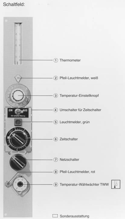 Dieser Schrank ist mit einem Temperatur-Wählwächter (TWW) ausgerüstet. Die Skala des TWW besitzt eine lineare Temperatureinteilung und der Pfeil-Leuchtmelder, rot ist gleichzeitig die Markierung für die Temperatur-Einstellung (siehe auch Seite 6 »Inbetriebnahme«). Der Wählwächter regelt beim eingestellten Temperaturgrenzwert weiter. Der Pfeil-Leuchtmelder rot, leuchtet dann inter­mittierend auf.