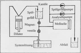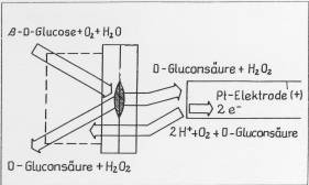 Die Bestimmung von Glukose oder Laktat beruht auf einem elektrochemischen Meßprinzip mit einem Biosensor. Mit Hilfe einer Analysenpumpe wird durch eine Meßzelle wahlweise Systemlösung, Kalibrier-, Kontroll- oder Patientenmaterial gefördert. Die sich in der Meßzelle befindliche Elektrode ist durch eine mehrschichtige Membran, in der sich das irrmobilisierte Enzym befindet, vom Flüssigkeitsstrom getrennt.Das Fließbild und die sich der Meßzelle abspielenden Reaktionen zeigen die Abbildungen: