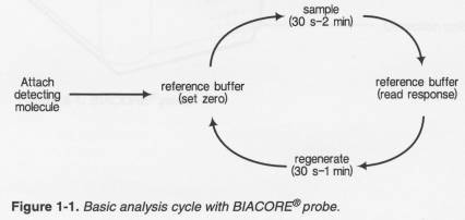Once the detecting molecule has been attached to the sensor probe, determining the presence or concentration of analyte with BIACORE@probe involves four simple steps (Figure 1-1):