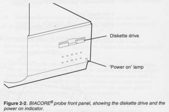 The main body of the detection unit houses the light source (a low temperature halogen lamp), detector and software for registering and interpreting the Signal from the Sensor probe, and a 3.5 " diskette drive for copying data to PC-formatted computer diskettes (See Section 4.7). A green lamp on the front panel indicates that the power is on.