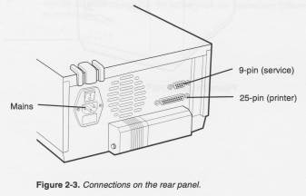 The rear panel of the detection unit has the mains power switch and connectors for mains power and a printer (25-pin computer connector). There is also a 9-pin computer connector which is used for Service purposes.
