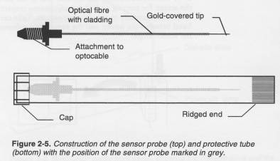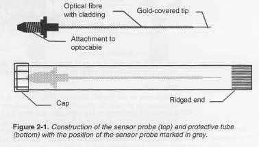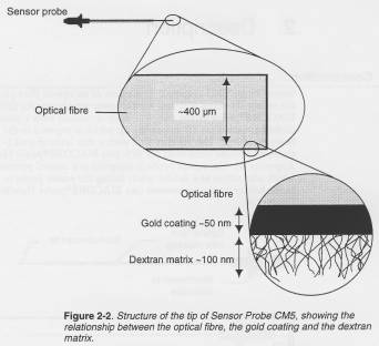 The sensor probe, where the actual detection takes place, is an optical fibre coated at the tip wich a gold layer (Figure 2-5). The detecting molecule is immobilized directly or indirectly an the surface to provide a biospecific sensor probe. A description of the surface characteristics and full instructions for immobilizing the detecting molecule and using the sensor probe are provided in a separate Sensor Probe Handbook.