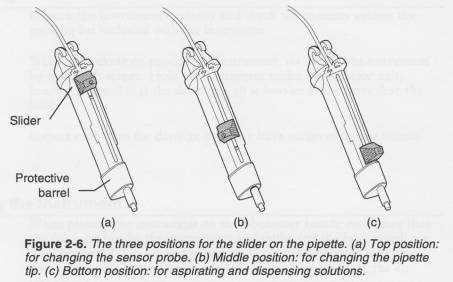 The middle position (locked by turning the slider) holds the tip of the sensor probe in the protective barrel, and is used when fitting or changing the pipette tip.
