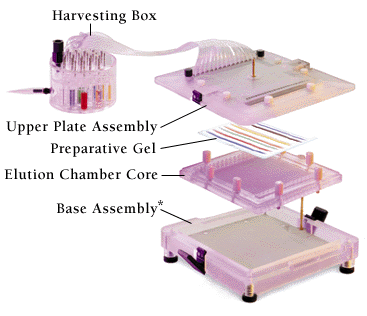 Whole gel eluters are additional components to the expanding line of preparative electrophoresis products from Bio-Rad. They complement the Rotofor preparative isoelectric focusing devices, and the prep cell preparative electrophoresis instruments. With the Rotofor cells, extraneous proteins in complex samples can be removed prior to screening with the whole gel eluter. Once an active biomolecule has been identified with an eluter, it can be purified in larger quantities with a prep cell.