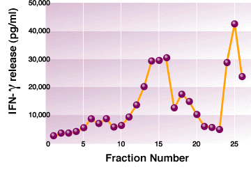 Stimulation of T cells in vitro with the M. tuberculosis fractions. IFN release from lymphocytes stimulated in vitro with a panel of ST-CF fractions. The lymphocytes were isolated from the spleens of TB-infected mice and stimulated for 48 hr with the fractions. Cytokines in the culture supernatant were measured by ELISA. All values are given as mean of triplicates ±SEM, and were obtained with cells pooled from 35 mice.