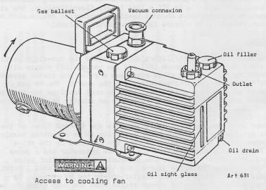Pressurised lubrication of the shaft Journals and the and faces of the rotors is provided by a sliding blade oparating in an acc--ntric housing at the inner and of the HV stator journal and actuated by the drive shaft. The oil is circulated from the oil box reservoir via a ganze filter and internal drillings to the pressurised distribution valve then to the groovad interstage journal and the rotor end faces. Nitrite shaft seals are positioned in the adaptor and in the HV stator. To prevent oil suck-back into the vacuum system when the pump stops for any reason, the oll distributor valve prevents further discharge of oil to the pump interior. Since the pumping chambers are air tight, this arrangement prevents both air and oil suck-back unless the gas ballast valve is open. (For protection in this case, refer to page 6 (f». The level of oil in the oil box reservoir is indicated by.a sight-glass mounted in the front of the oil box. Oil filter and drain plugs are fitted at the top and bottom of the oil box, respectively.