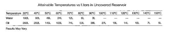 An immersion circulator can be used with reservoirs of varying size and shape, as well as with different types of fluid. The following chart indicates the maximum temperature that can be achieved, dependent on the reservoir's size and fluid's surface area: