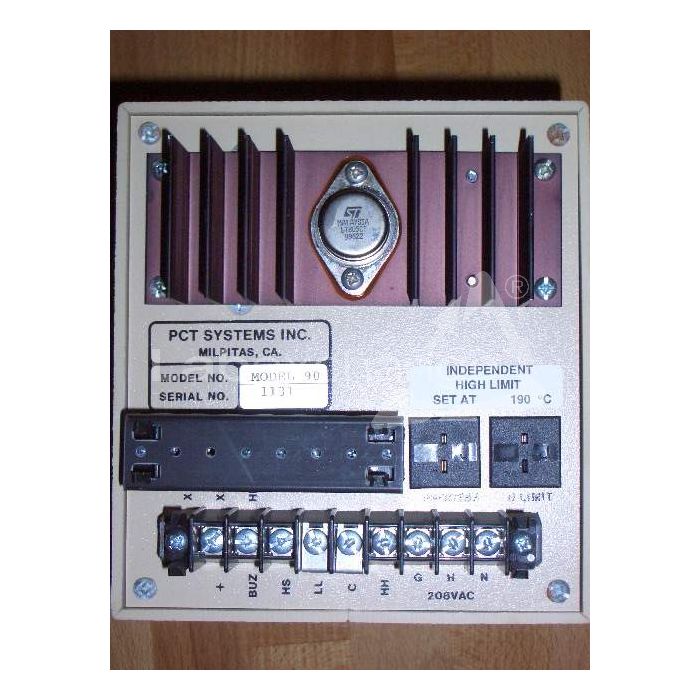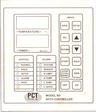 The Model 90 is a Microprocessor based controller/timer. It monitors temperature utilizing a Type J thermocouple sensor and controls bath temperature with a standard three mode (PID) control scheine, with anti-reset windup. Numerous status and alarm functions are incorporated to monitor various system parameters. Additionally, a down-count/up-count programmable timer, with cumulative over timer and pre-warn is integrated into the system. A pilot duty photoisolated triac output is used to drive a remote heater power relay. An optional power pack may be furnished that will provide the load carrying solid state switching an board. Additionally, an optional Auxiliary Relay may be provided. This may be utilized for either Timer or DI output.