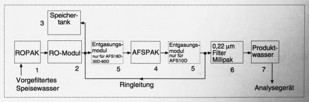 Vorbehandeltes Leitungswasser fließt durch den ROPAKTM (1), der die Umkehrosmose-Membran in dem RO-Modul vor Verunreinigungen, Chlorangriffen und Härte-Ausfällungen schützt. Vom ROPAK fließt das Wasser durch das ROModul (2). In dem System AFS10 fließt das Wasser entweder in den unter Druck stehenden Tank (3) zur Zwischenspeicherung oder zum AFSPAK (4), wo der Widerstandswert auf größer als 10 MQ-cm verbessert wird. Das Produktwasser durchströmt dann entweder ein optionales Entgasungsmodul (5), in welchem gelöste Gase entfernt werden, oder direkt durch einen 0,22 p m-Endfilter (6), in welchem Bakterien zurückgehalten werden. Das vollständig gereinigte Wasser fließt durch den Reinstwasseranschluß (7) zum klinischen Analysegerät. In den Systemen AFS18D und AFS30D durchströmt das Wasser das Entgasunsgsmodul, bevor es den AFSPAK zu Verbesserung des Widerstandswerts durchströmt.