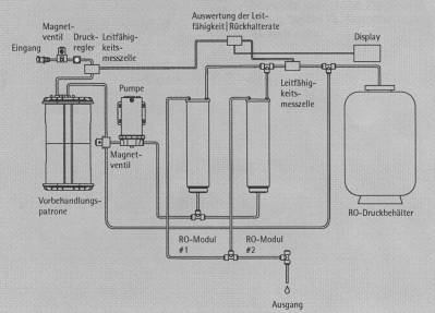 Den eigentlichen Wasseraufbereitungskomponenten ist ein Sicherheitsmagnetventil vorgeschaltet. Dieses ist nur bei Betrieb der Anlage geöffnet. Nach Passage des eingebauten Druckreglers wird das Speisewasser mit Hilfe der Vorbehandlungskartusche vorgereinigt. Eine Pumpe sorgt für den geeigneten Betriebsdruck und filtriert das Wasser durch die beiden parallel geschalteten Umkehrosmosemodule. Das Produktwasser kann sowohl in einem Drucktank als auch in einem offenen Tank* gelagert werden. Das Konzentrat wird mit einem Spülschlauch dem Abwasser zugeführt. Die Anlage hat zur Qualitätskontrolle eine temperaturkompensierte Leitfähigkeitsmessung im Speisewasser und im Produktwasser.