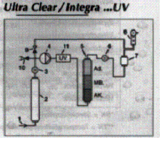 Das UV bei der jeweiligen Typenbezeichnung steht für ultraviolette Photooxidation bei 185 nm und 254 nm. Die Strahlung bei diesen beiden Wellenlängen sorgt für die Erzeugung hochreaktiver freier Hydroxylradikale, durch die über eine photochemische Kettenreaktion gelöste organische Verbindungen oxidiert werden. Ein TOC-Wert <3 ppb ist Standard. Die Desinfektion des Wassers basiert auf der Zerstörung der DNA von Mikroorganismen. Dieser Prozeß läuft bei der Strahlung von 254 nm ab und gewährleistet ein Abtöten vorhandener Mikroorganismen. Die Lebensdauer des Strahlers beträgt ca. 6.000-7.000Stunden und wird in der Klartextanzeige der Steuerung angezeigt.