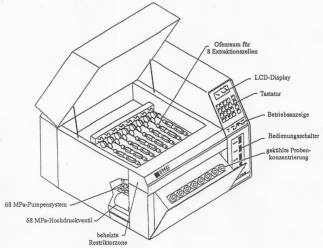 Der SFE-703 ist ein eigenständiges, automatisiertes Extraktionssystem, mit dem bis zu acht Proben gleichzeitig extrahiert werden können. Der SFE-703 beinhaltet eine exakte Probenbeheizung, beheizte Restriktoren, eine Pelletier-Kühlung der Probenauffanggefäße, eine Flußkontrolle aller Extraktionskanäle und eine bedienerfreundliche Steuerungs-Software. Dieses mit dem Ziel, reproduzierbare Ergebnisse und hohe Wiederfindungsraten zu erzielen.
