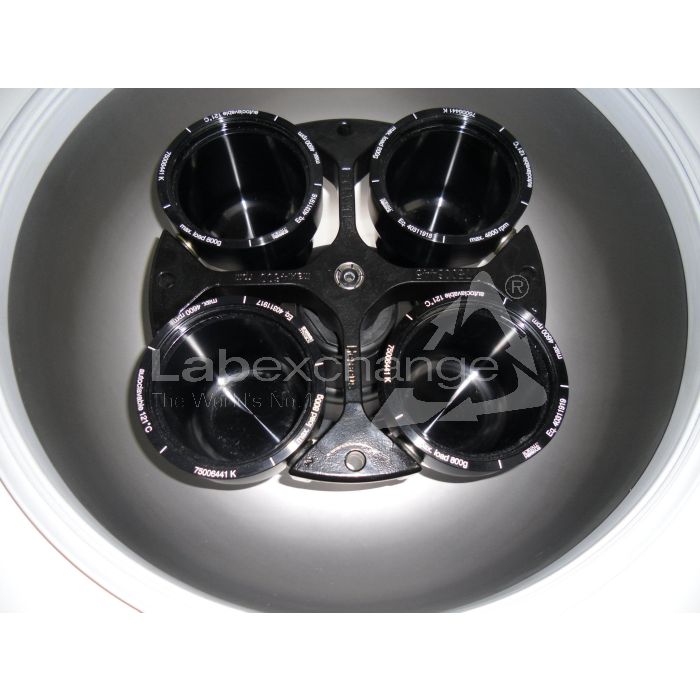 Thermo Kendro Réfrigérés table centrifugeuse Multifuge 3S-R. 230 V. 50 Hz. 1900 W. Réfrigérant R404a. Timer. Affichage numérique. Panneau de côntrol. Signe CE. AC: 2003. Avec 4-fois roteur 75006445. Max. 4600 tr/min. Incl. 4x gobelets à fonds rond 75006441 K. Max. 800 g. À l autoclave à 121°C. 4x insertions pour chaqune 5x50 ml. 4x insertions pour chaqune 12x15 mL.