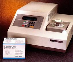 The GeneAmp® PCR System 9600 is an automated instrument, specifically designed for controlling the times and temperatures required by the GeneAmp Polymerase Chain Reaction (PCR) process for nucleic acid amplification. The GeneAmp PCR System 9600 consists of a 96-well position aluminum sample block, which is heated by a film heater and cooled by an internal refrigeration unit. User interface is through a full numeric keypad with heating and cooling indicator lights and information viewed an a 2x20 character fluorescent display. An optional printer can be attached through the RS232C interface and hard copy of the programmed protocols and achieved times/temperatures can be obtained.