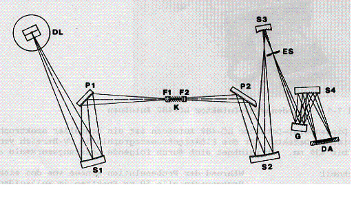 Im Diodenarray-Detektor LC-480 AutoScan wird die UV-Strahlung einer Deuteriumlampe (DL) mit Hilfe des sphärischen Hohlspiegels (S1) und des Planspiegels (P1) auf das Eintrittsfenster (F1) der Durchflußzelle (K) fokussiert. Das aus der Durchflußzelle austretende Strahlenbündel wird mit Hilfe des Planspiegels (P2) und den beiden sphärischen Hohlspiegeln (S2 + S3) auf den Eintrittsspalt (ES) fokussiert, bevor das austretende Strahlenbündel mit Hilfe des holographischen Gitters (G) spektral zerlegt wird. Mit dem sphärischen Hohlspiegel (S4) wird das spektral zerlegte Strahlenbündel auf das Diodenarray (DA) als Spektrum abgebildet.