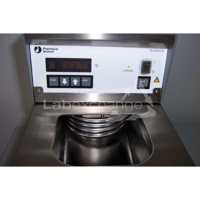 MultiTemp III both supplies coolant for high voltage techniques and provides temperature control at higher temperature (e.g. 60°C) when performing DNA sequencing. When used with equipment such as the Amersham Pharmacia Biotech Multiphor II electrophoresis unit, two units can be connected to MultiTemp III at the same time.