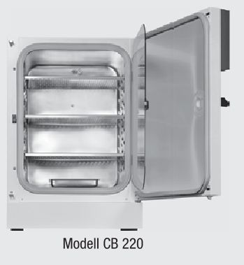 Incubatore Binder CO² CB 220 E 6.1. Temperatura nominale: 187 °C. 3 ripiani forati. 1 vaschetta raccogli-gocce. Pannello interno: acciaio inox. Porta di sicurezza interna (vetro). Display con pulsanti e indicatore di temperatura rotante. Indicatore di CO². Base su ruote. Con serratura. Dimensioni esterne AxLxP: 114 x 74 x 76. 230 V, 50/60 Hz. 1500 W, 6,6 A.