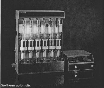 SOXTHERM AUTOMATIC Vollautomatisches Modell mit externer, mikroprozessorgesteuerter Temperaturregelung und Überwachung. Freie Programmierbarkeit des Extraktionsablaufes über die Phasen 1 bis 5. Bis zu 100 verschiedene Programmabläufe für alle nur denkbaren Proben und Lösungsmittel sind Speicher- und abrufbar.
